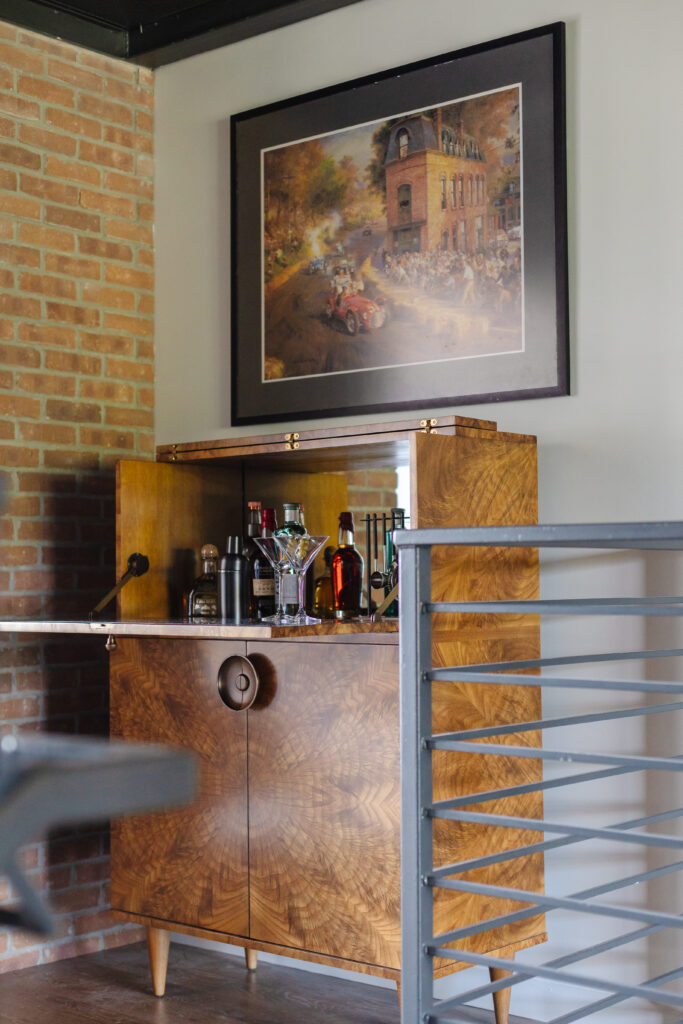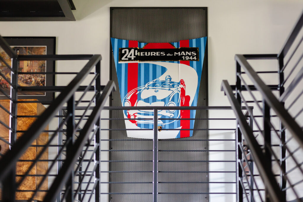 Accents of burled wood in custom pieces such as the bar cabinet and desk add depth and sophistication, while thoughtfully selected wallcoverings introduce texture and visual interest in the bedroom and den. Signature styling throughout completes a space that balances performance and comfort, capturing both the passion for automotive culture and the art of elevated living.