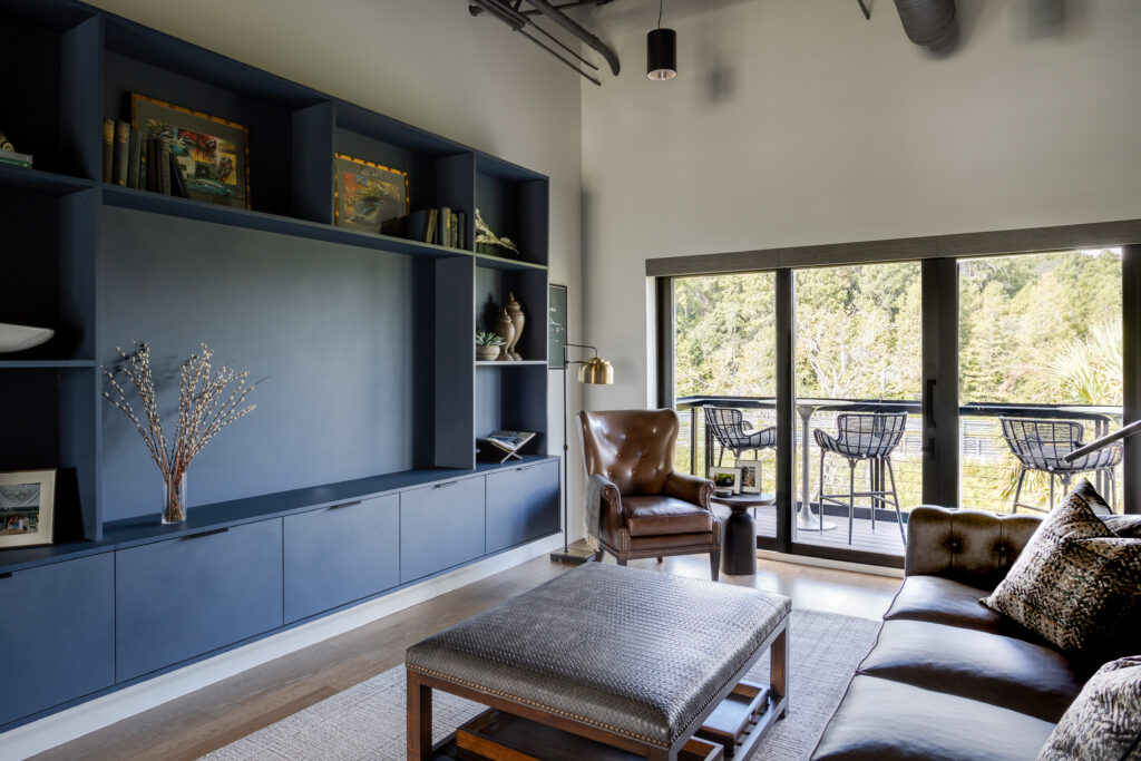 The interior was envisioned as moody and masculine, blending traditional influences with modern luxury. Drawing from the client’s personal artwork and aesthetic, the design layers classic silhouettes within the industrial architecture of the loft. Rich leathers, tailored furnishings, and warm finishes soften the space while maintaining its bold character.