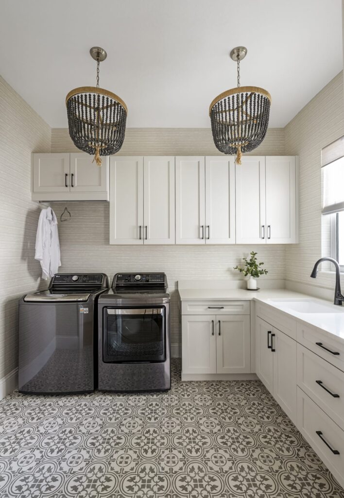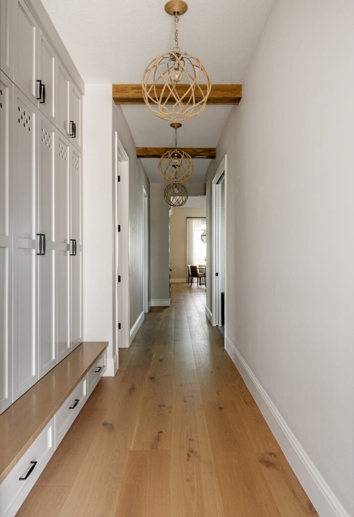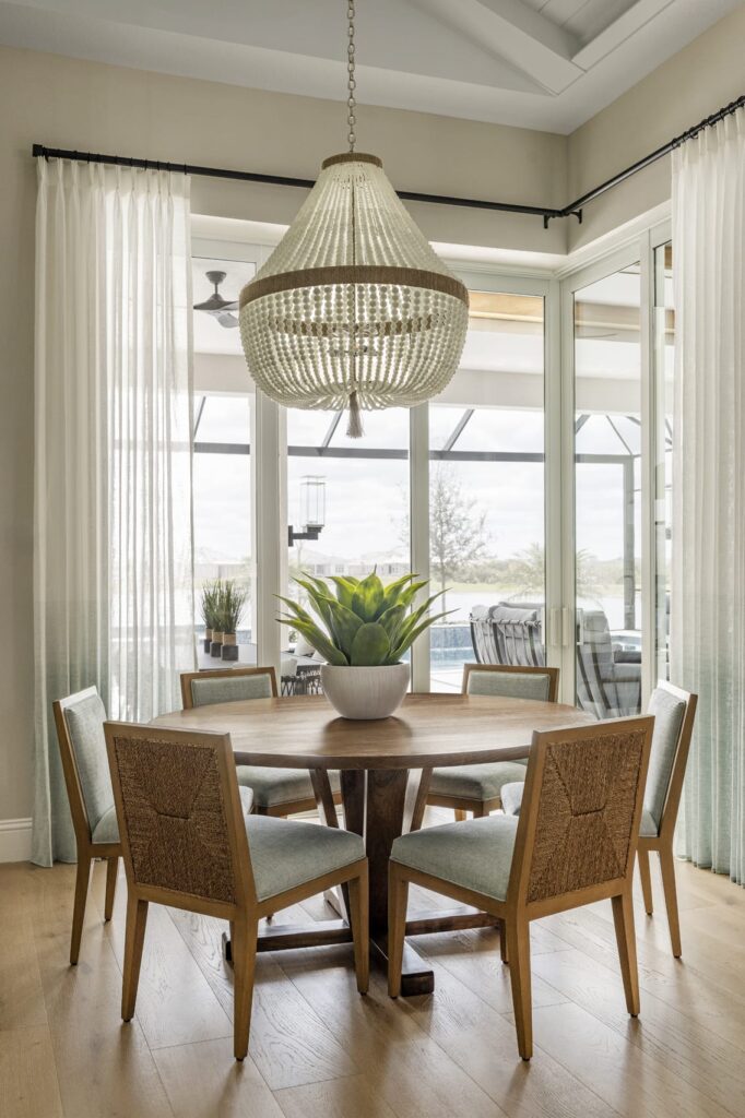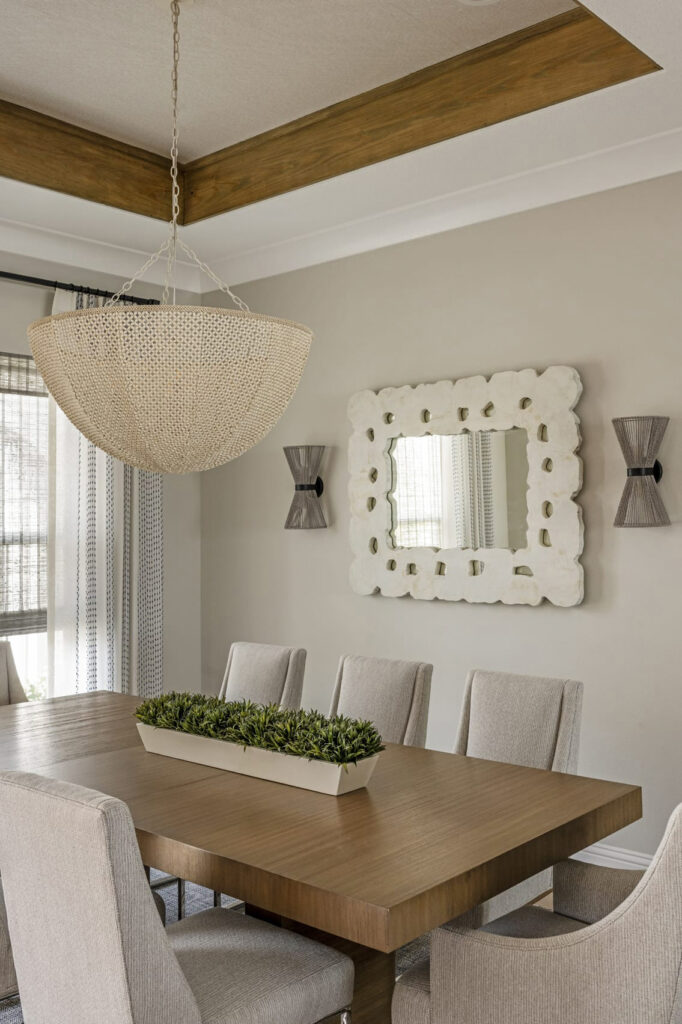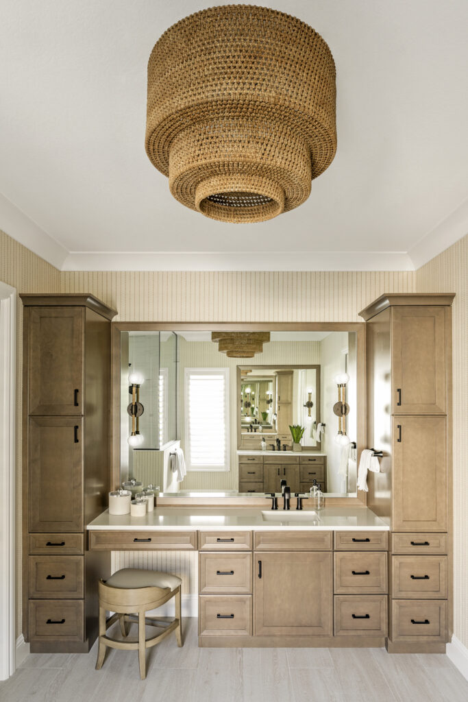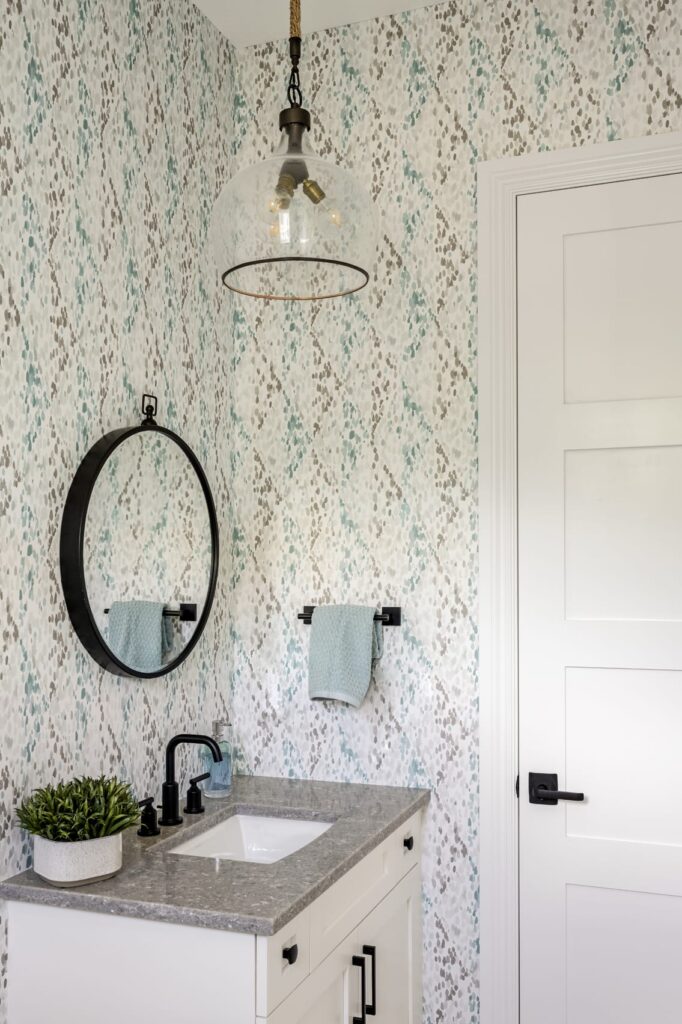 Ceiling details in the foyer, kitchen, and primary bedroom, along with trim and wallpaper moments in the dining room and bedrooms, create visual interest without overwhelming the space. The result is a bright, textured coastal home designed to evolve with the family and support everyday living with ease and intention.