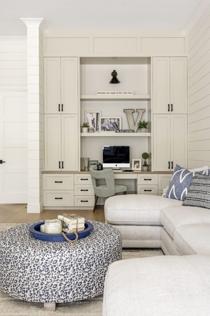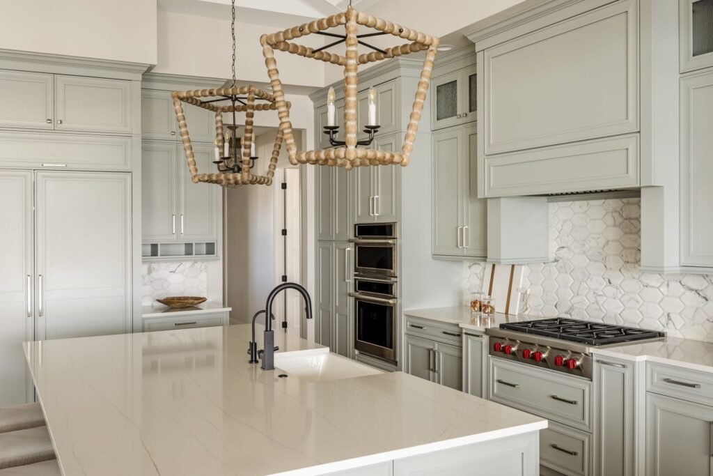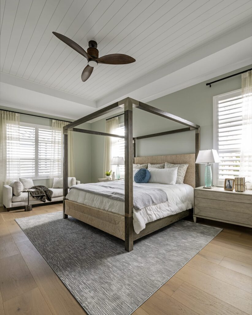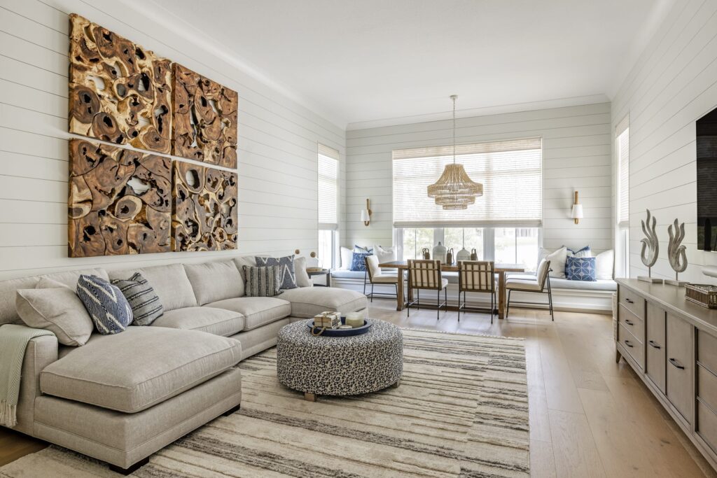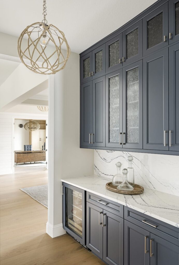 The design emphasizes light, texture, and livable materials layered throughout the space. A coastal palette rooted in a blue kitchen design set the tone, with subtle hints of blue carried throughout to maintain a cohesive, relaxed feel. Architectural detailing plays a key role in adding warmth and character, from shiplap walls and ceiling treatments to applied trim, beams, and thoughtfully layered finishes.