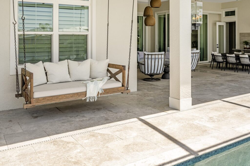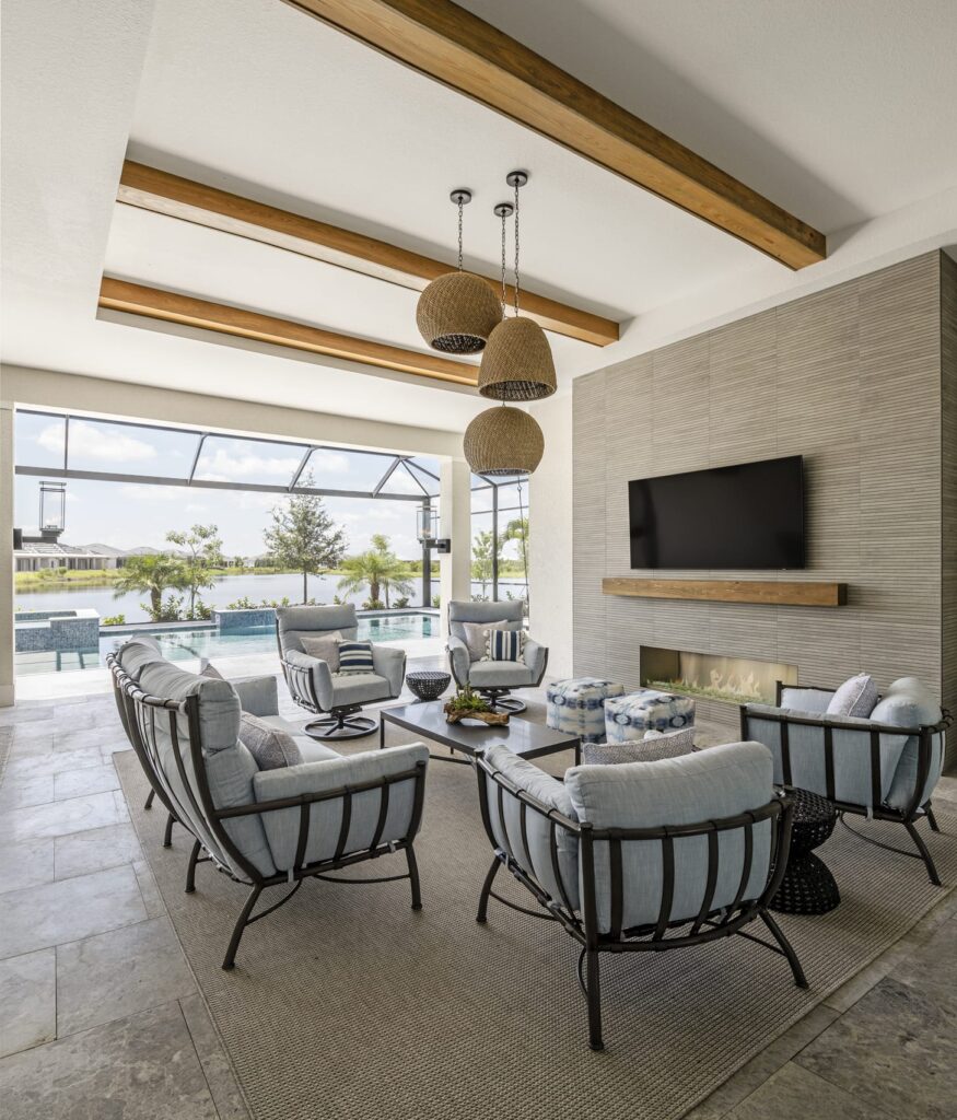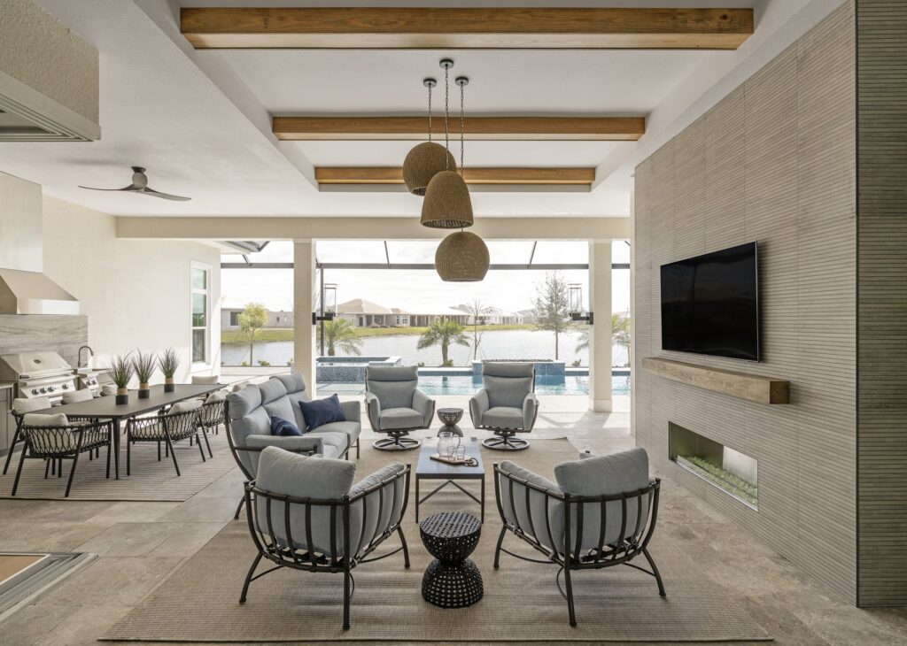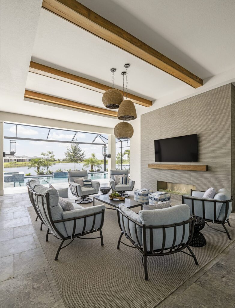 The design emphasizes light, texture, and livable materials layered throughout the space. A coastal palette rooted in a blue kitchen design set the tone, with subtle hints of blue carried throughout to maintain a cohesive, relaxed feel. Architectural detailing plays a key role in adding warmth and character, from shiplap walls and ceiling treatments to applied trim, beams, and thoughtfully layered finishes.