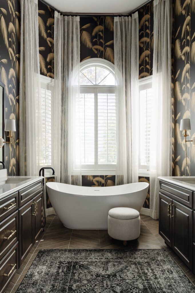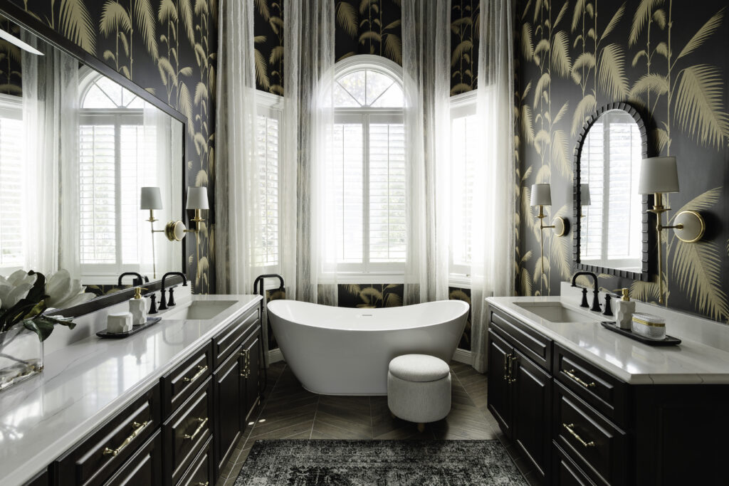 Beyond the suite, the dining room was elevated with custom millwork, refined furnishings, and a statement chandelier designed for elegant entertaining. The kitchen was fully renovated with custom cabinetry, high-end appliances, and a waterfall-edge island that anchors the space. The primary bathroom completes the transformation with a spa-inspired layout, featuring a freestanding soaking tub, seamless glass shower, and luxurious tilework. Together, these spaces reflect a harmonious balance of beauty, function, and lifestyle-driven design.