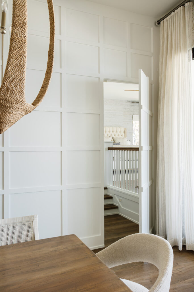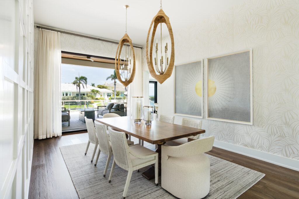 Our process focused on layered lighting, intentional material selection, and architectural harmony. Statement and ambient lighting were selected to support the natural flow of the home, while wallpaper and trim details introduce texture, pattern, and visual depth without overwhelming the space. Each element was chosen to feel cohesive, purposeful, and timeless.